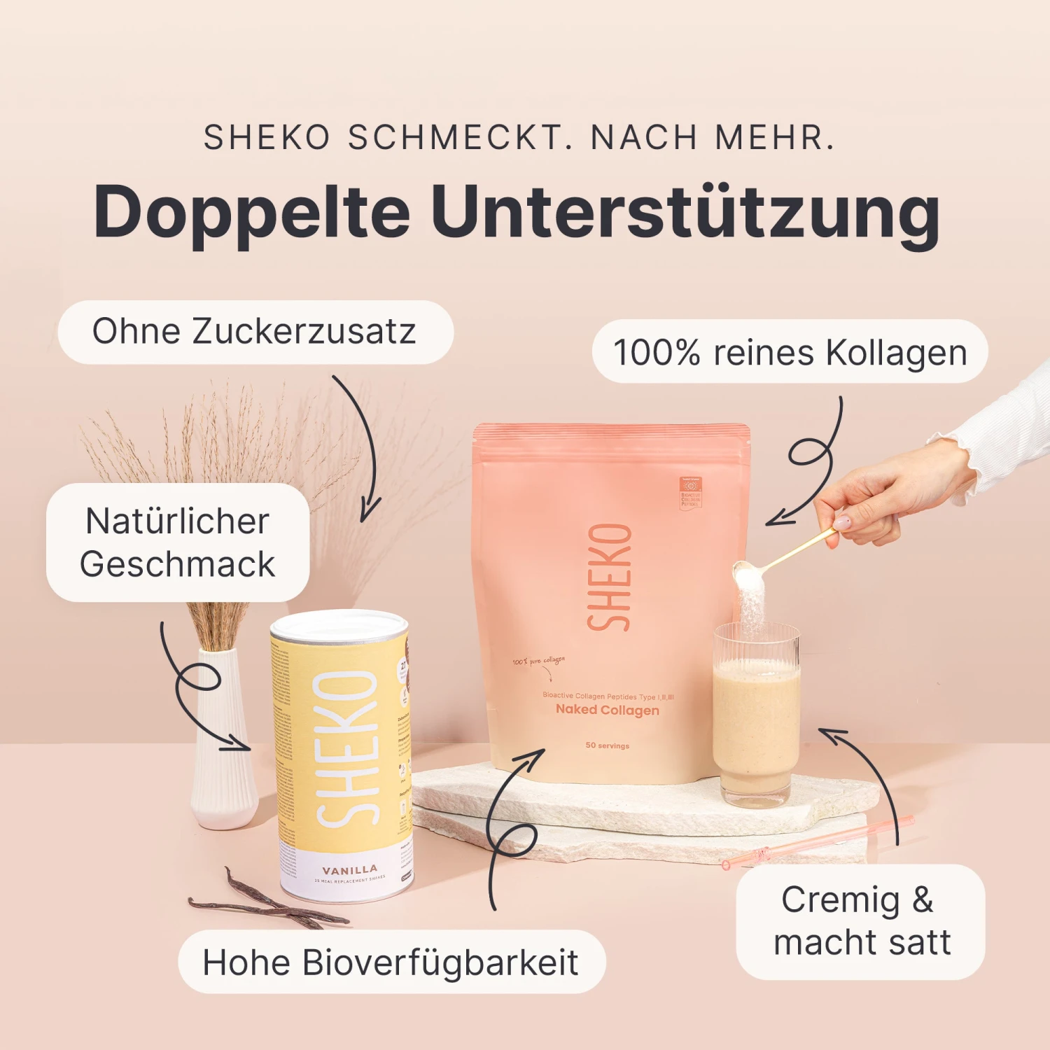 Mit unseren lecker-cremigen Mahlzeitersatz-Shakes mit nur 202 Kcal und 27 Vitaminen und Mineralien pro Shake sowie unser klinisch getestetem Naked Collagen bist Du bestens fĂŒr Deine Gewichtsabnahme und das erreichen Deines WohlfĂŒhl-Ichs ausgerĂŒstet. Der Proteinanteil des hydrolysiertem Kollagens gilt nĂ€mlich studienbasiert als natĂŒrlicher AppetitzĂŒgler.