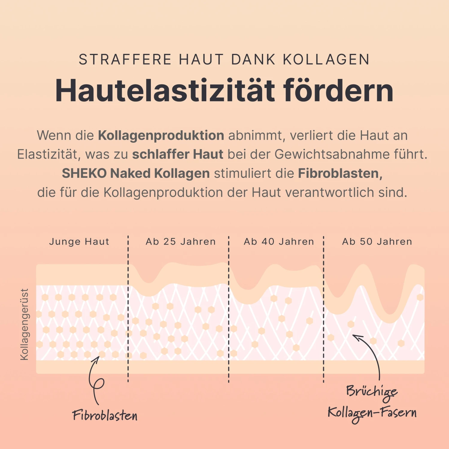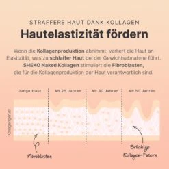 Ab 25 Jahren beginnt unser Körper nĂ€mlich weniger Kollagen zu produzieren. Dies kann zu sichtbaren Zeichen des Alterns und unter anderem auch BindegewebsschwĂ€che mit sich bringen. Das enthaltene VERISOLÂź erhöht nach Studien die HautelastizitĂ€t (1). Gerade bei einer groĂen Gewichtsreduktion ist es sinnvoll die ElastizitĂ€t der Haut zu unterstĂŒtzen, um hĂ€ngende Haut weitestgehend zu vermeiden.