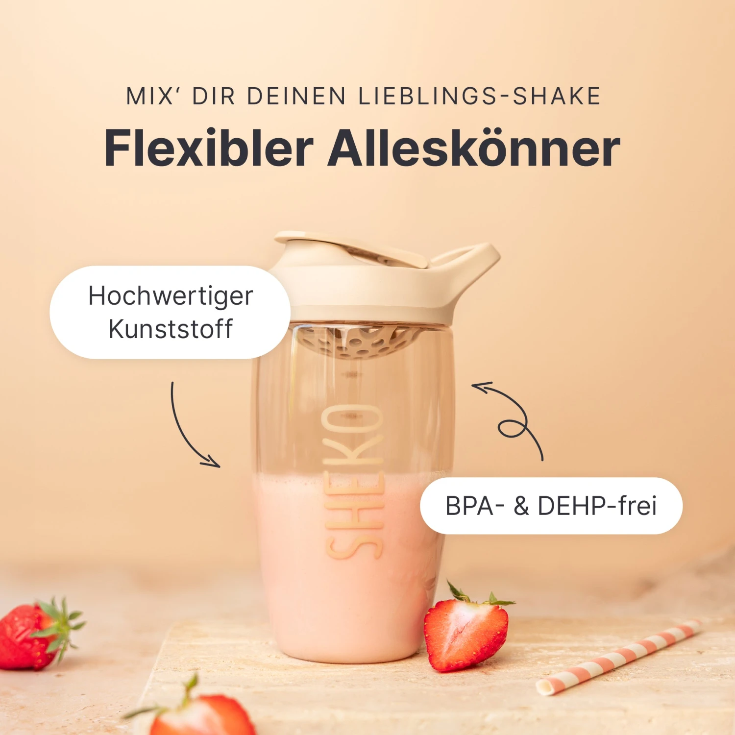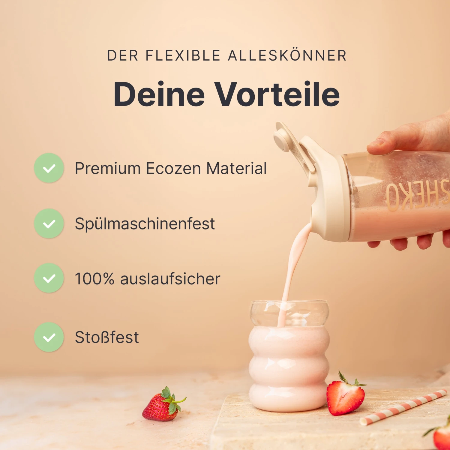 Mit diesem Shaker willst Du Deine Shakes nie wieder aus etwas anderem trinken. Das speziell entwickelte Gitter sorgt dafĂŒr, dass sich KlĂŒmpchen auflösen und der Shake schön schaumig-cremig wird. Wie ein richtiger Milchshake eben! Dabei lĂ€sst es sich einfach auseinanderbauen und ist so leicht zu reinigen â auch im GeschirrspĂŒler. So kannst Du Dich voll und ganz auf den köstlichen Geschmack konzentrieren. Lass es Dir schmecken!