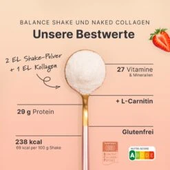 Unser Naked Collagen basiert auf einer innovativen Formel, die aus einem sorgfältig ausgewählten Kollagen-Komplex besteht. Die 3 enthaltenen Kollagen-Typen sind durch Studien belegt und decken verschiedenste Körperbereiche ab. Unser Naked Collagen bildet die perfekte Ergänzung zu unseren Balance Shakes mit 27 Vitaminen und Mineralien. Gemeinsam bringen Sie Dich von innen und außen zum Strahlen.