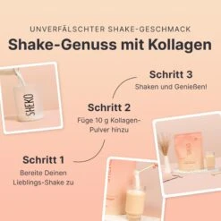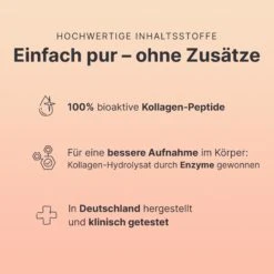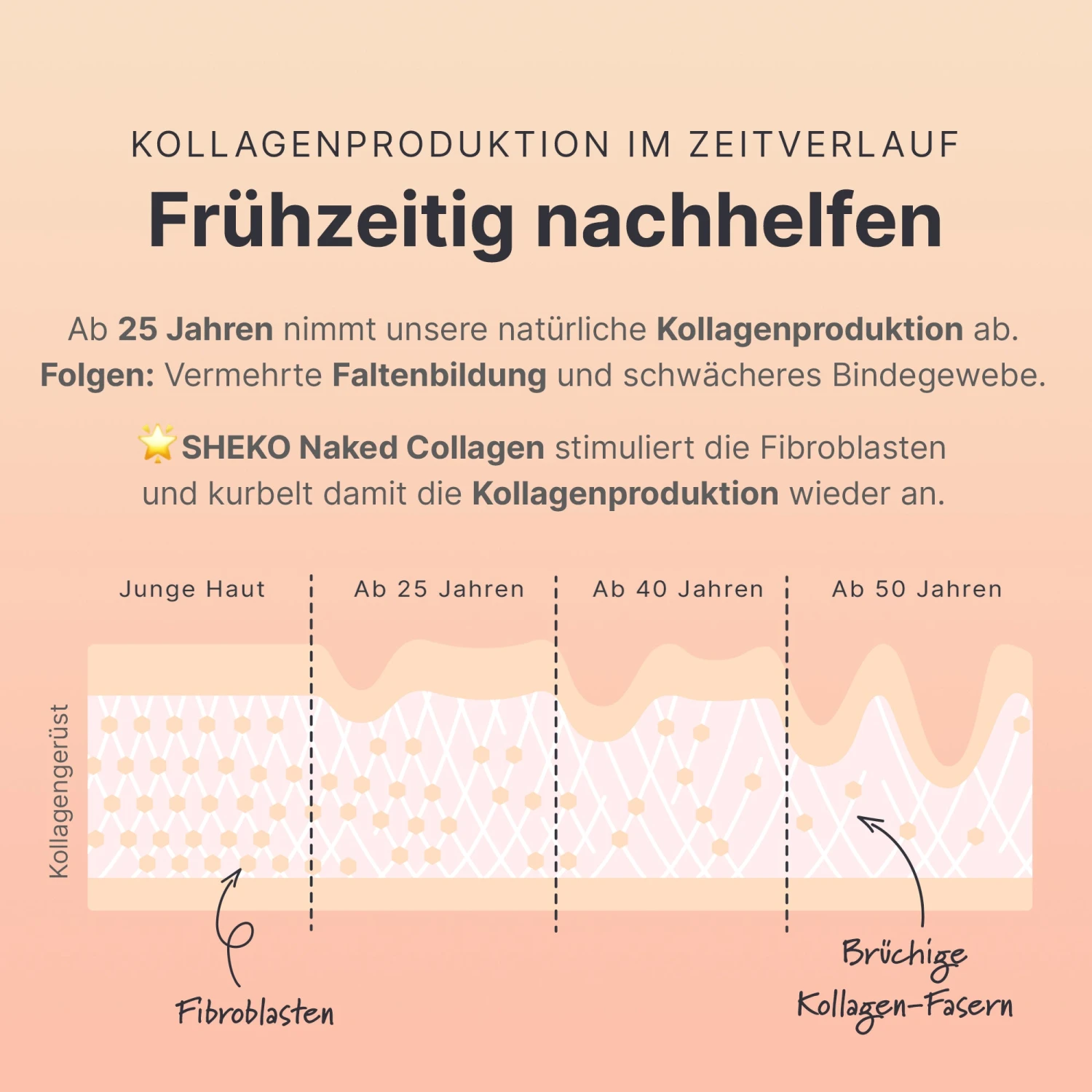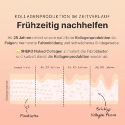 Unser Naked Collagen bietet Dir eine wissenschaftlich fundierte Lösung für zeitlose Schönheit und ganzheitliches Wohlbefinden. Kollagen, ein essenzieller Baustein unseres Körpers, stellt mit 30% den Hauptbestandteil der Proteine dar. Unsere natürliche Kollagenproduktion nimmt bereits ab 25 Jahren ab, was zu sichtbaren Zeichen des Alterns wie Falten, Bindegewebsschwäche und sprödem Haar führen kann. Daher lohnt es sich, frühzeitig entgegenzuwirken!