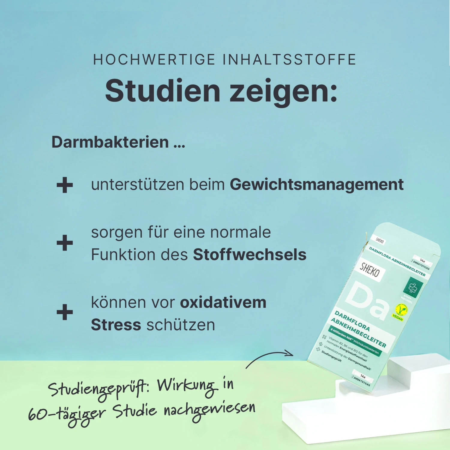 Darmbakterien entscheiden darĂŒber, ob wir mĂŒhelos schlank bleiben oder regelmĂ€Ăig mit unseren Pfunden zu kĂ€mpfen haben. Studien zeigen: Ein Ăberschuss an “Dickmacher-Bakterien” (Firmicutes) erschwert das Abnehmen. Hier setzt unser Darmflora Abnehmbegleiter an: Zusammengesetzt aus studienbasierten BakterienstĂ€mmen und einer ausgeklĂŒgelten Vitaminkombination unterstĂŒtzt er Deine DarmgesundheitÂč und regt den Energiestoffwechsel gezielt an.