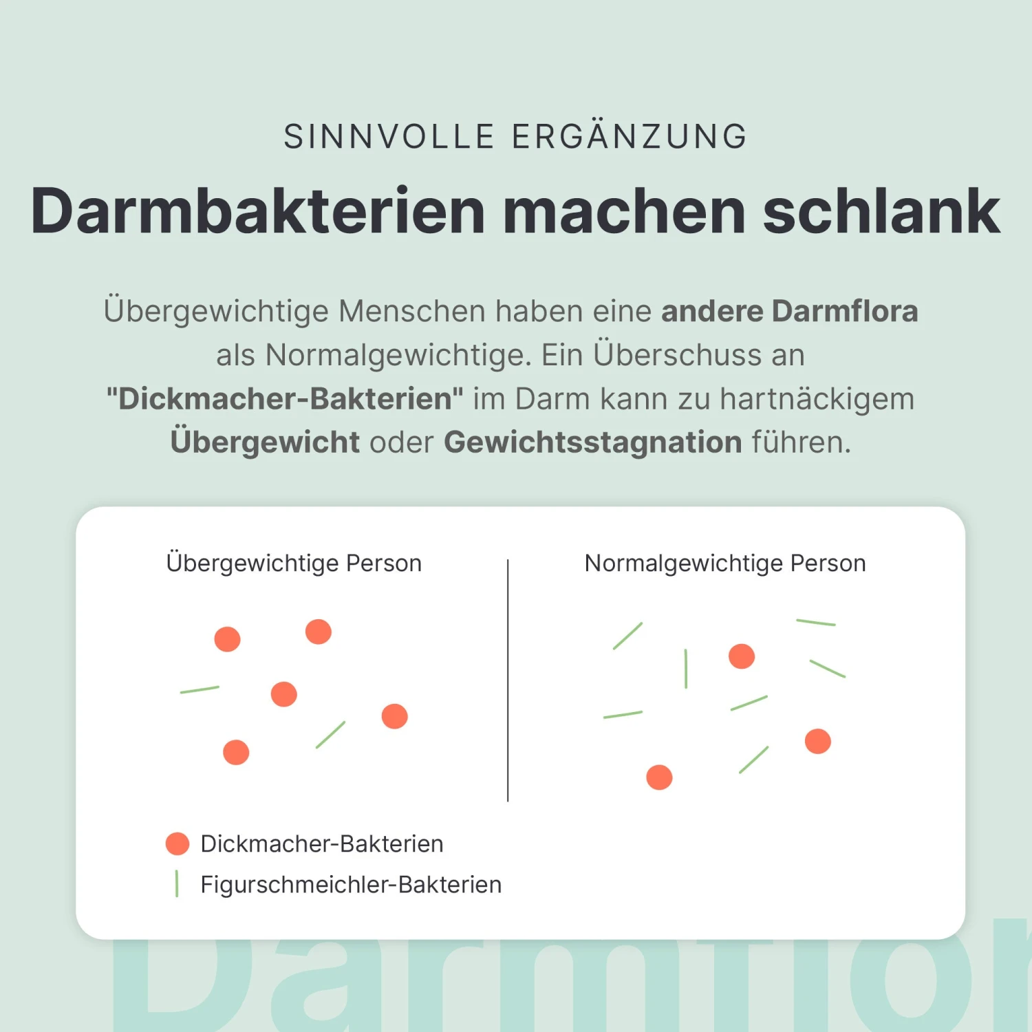 Darmbakterien entscheiden darĂŒber, ob wir mĂŒhelos schlank bleiben oder regelmĂ€Ăig mit unseren Pfunden zu kĂ€mpfen haben. Studien zeigen: Ein Ăberschuss an “Dickmacher-Bakterien” (Firmicutes) erschwert das Abnehmen. Hier setzt unser Darmflora Abnehmbegleiter an: Zusammengesetzt aus studienbasierten BakterienstĂ€mmen und einer ausgeklĂŒgelten Vitaminkombination unterstĂŒtzt er Deine DarmgesundheitÂč und regt den Energiestoffwechsel gezielt an.