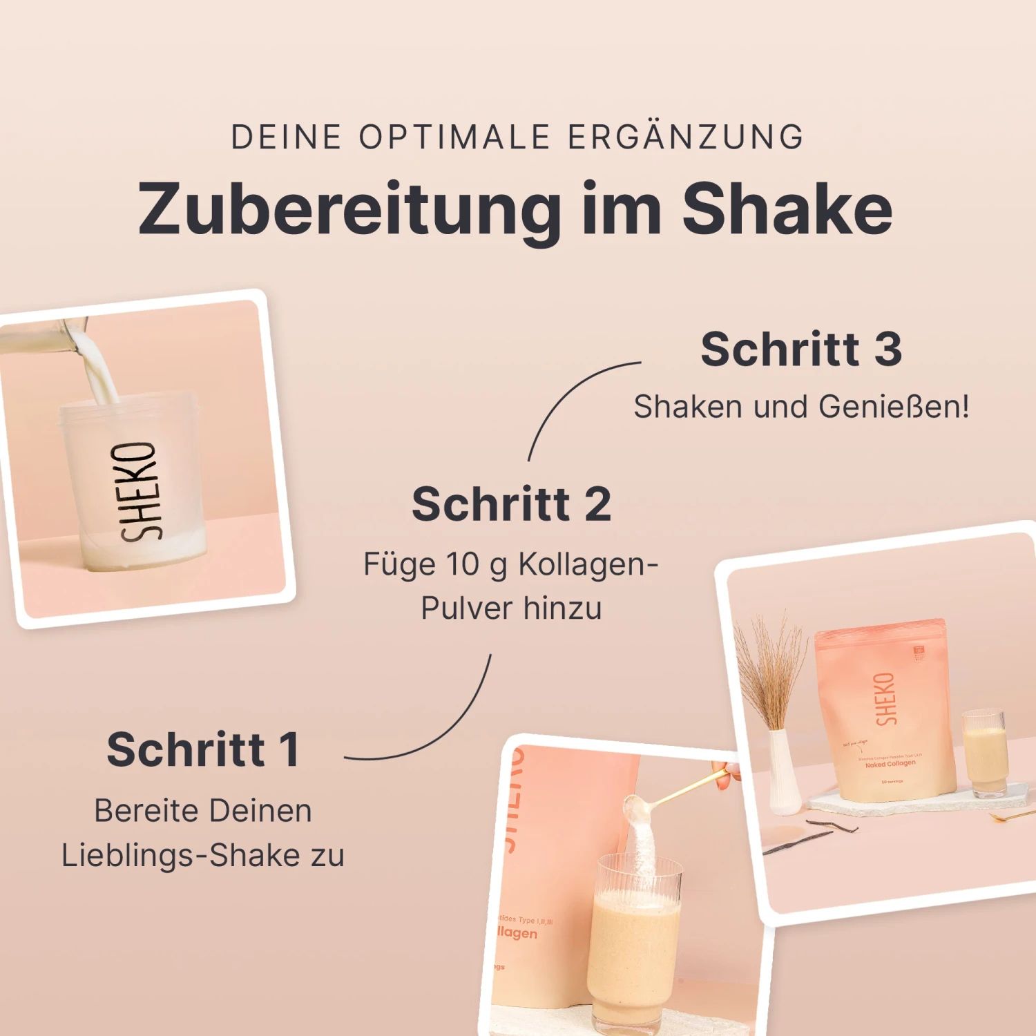 Beim Altern geht es nicht nur um äußere Schönheit. Kollagen macht nämlich in unserem Körper mit 30% den Großteil der Proteine aus. Nimmt die natürliche Kollagenproduktion ab 25 Jahren ab, bringt dies Effekte wie Faltenbildung, Bindegewebsschwäche, schwache Nägel, Haare und Knochen, sowie Schmerzen und Steifheit in den Gelenken mit sich. Hier kommen Naked Collagen mit 3 ausgewählte Marken-Kollagen-Typen und unsere Balance Shakes mit 27 Vitaminen und Mineralien ins Spiel. Denn gestärkte Gelenke und Knochen lassen uns länger fit bleiben und noch möglichst lange all die schönen Dinge im Leben mitmachen. Einfach einmal täglich 10 g Naked Collagen in Deinen Shake rühren – dieser bleibt dabei geschmacklich unverändert und lecker wie immer.😋